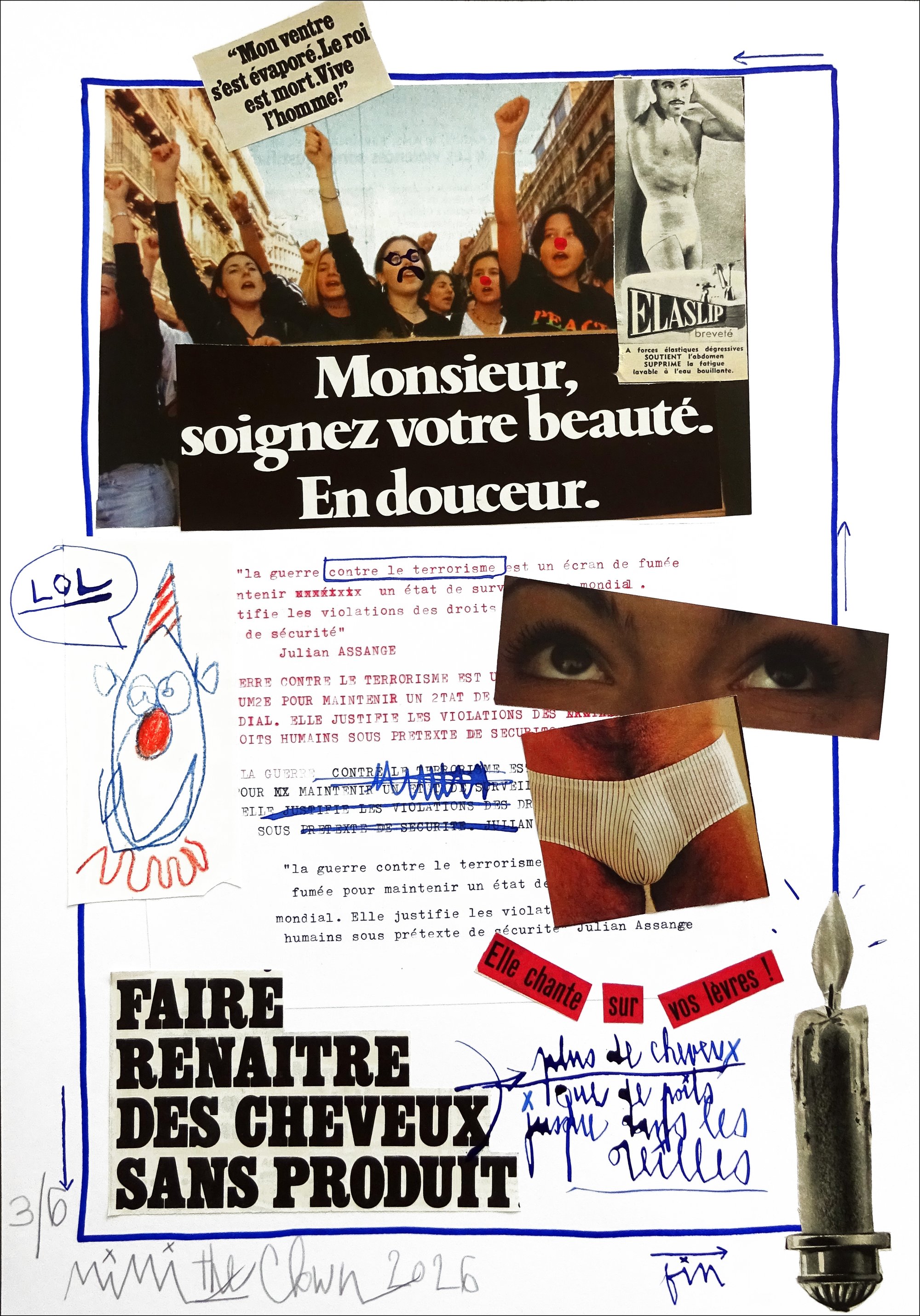 L'oeuvre "soignez votre beauté en douceur" est la troisième composition de « La preuve par l’image », série de 6 collages sur papier qui aborde notre relation à l’image à l’ère du numérique extrême — c’est-à-dire un monde saturé d’écrans, de flux visuels continus et de production d’images instantanée. Cette série s’inscrit dans une recherche plus large sur notre dépendance aux images, intitulée « Écran Total ».